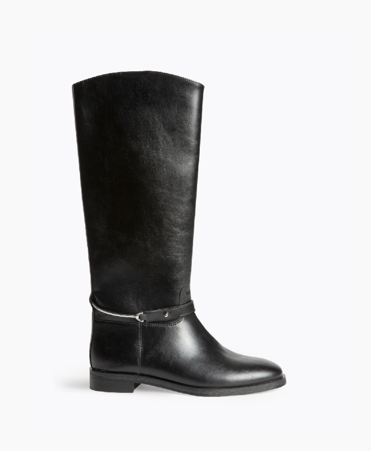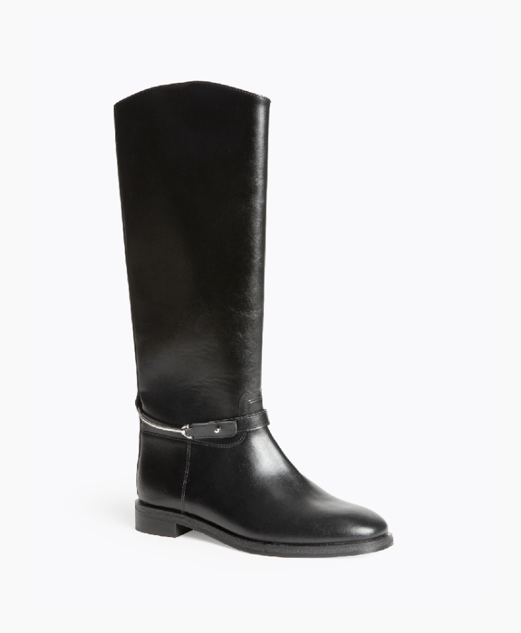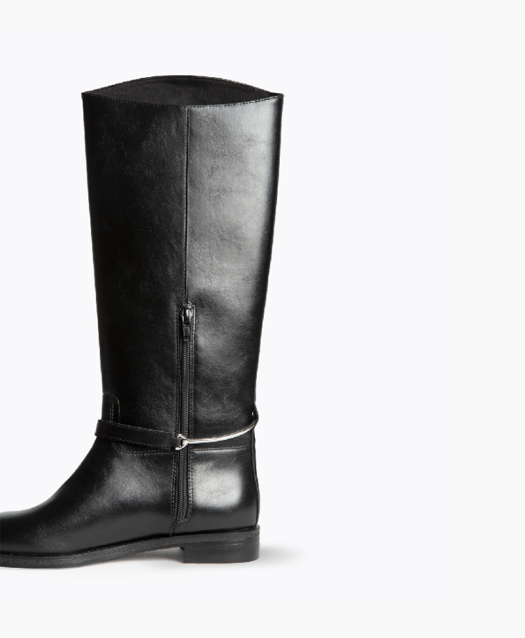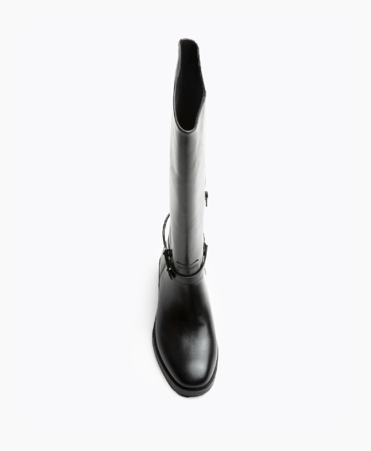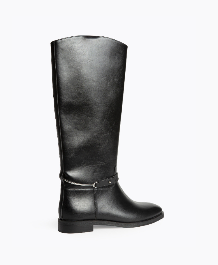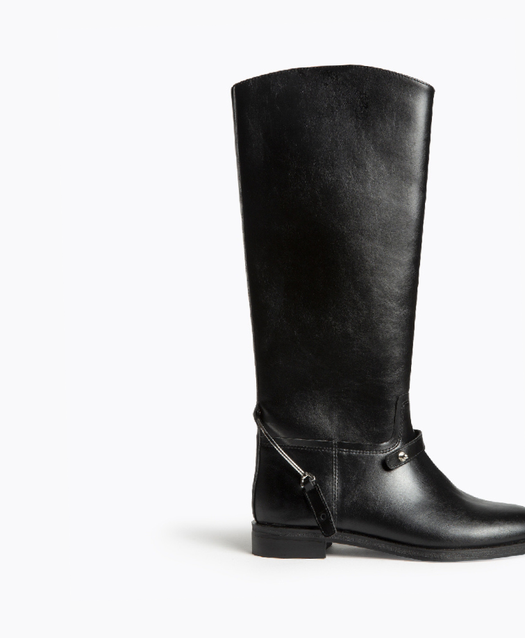 Bota rasa disponível em preto. Corte com pormenor de pesponto. Fivela metálica decorativa. Fecho na parte lateral interna. Biqueira arredondada.