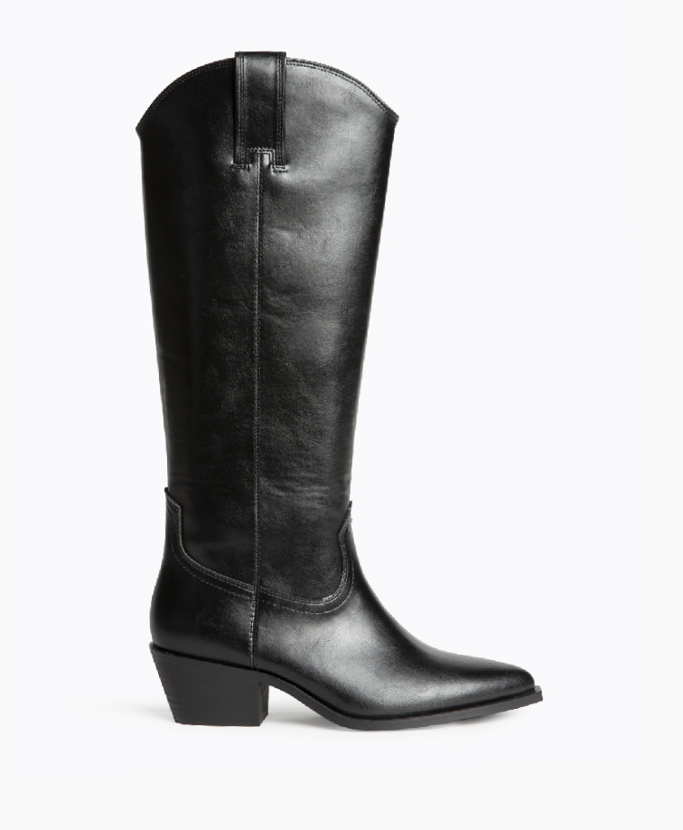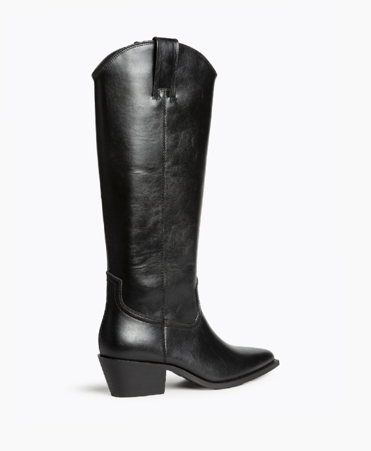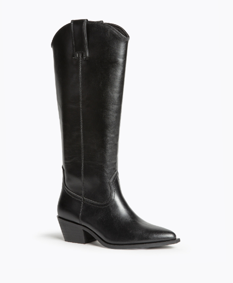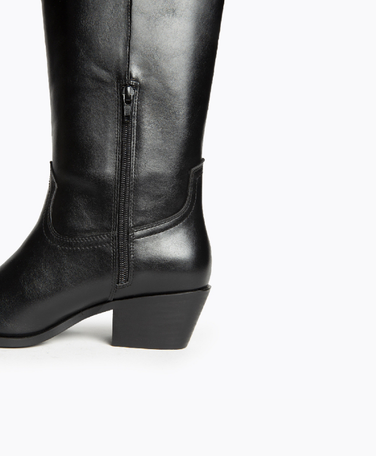 Bota de salto baixo disponível em três cores: preto, camel e café. Estilo cowboy. Puxadores laterais. Biqueira pontiaguda. Tacão quadrado. Fecho na parte lateral interna.