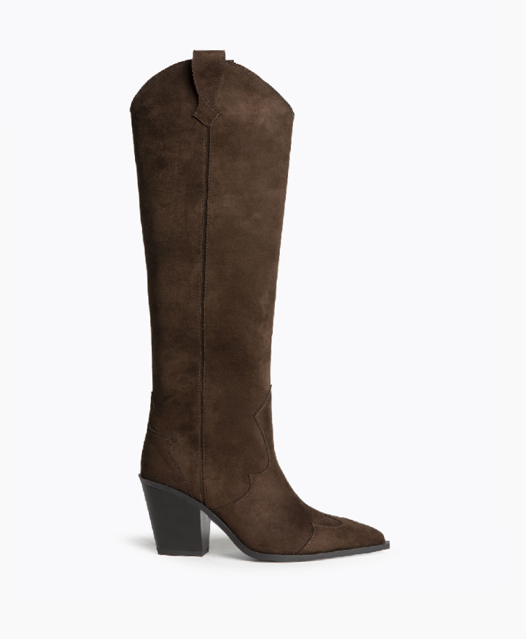 Bota de salto alto disponível em três cores: café, camel e preto. Estilo cowboy. Corte com detalhe de pespontos. Puxadores laterais. Biqueira pontiaguda. Tacão quadrado. Fecho na parte lateral interna.