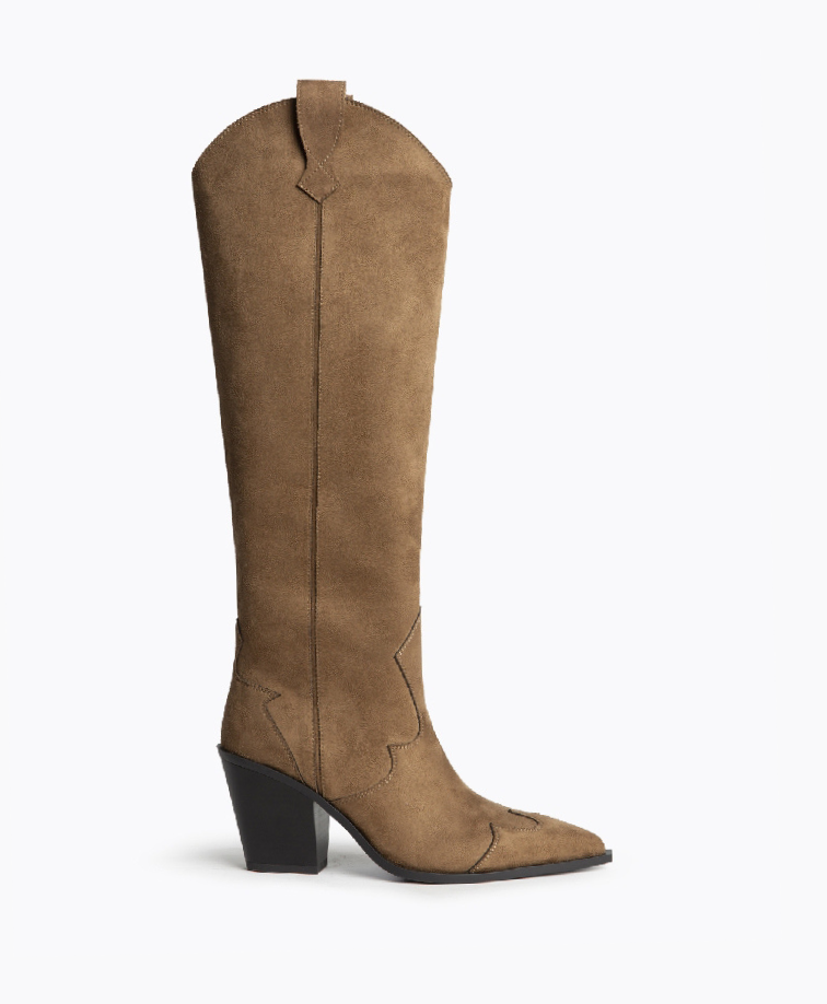 Bota de salto alto disponível em três cores: camel, café e preto. Estilo cowboy. Corte com detalhe de pespontos. Puxadores laterais. Biqueira pontiaguda. Tacão quadrado. Fecho na parte lateral interna.