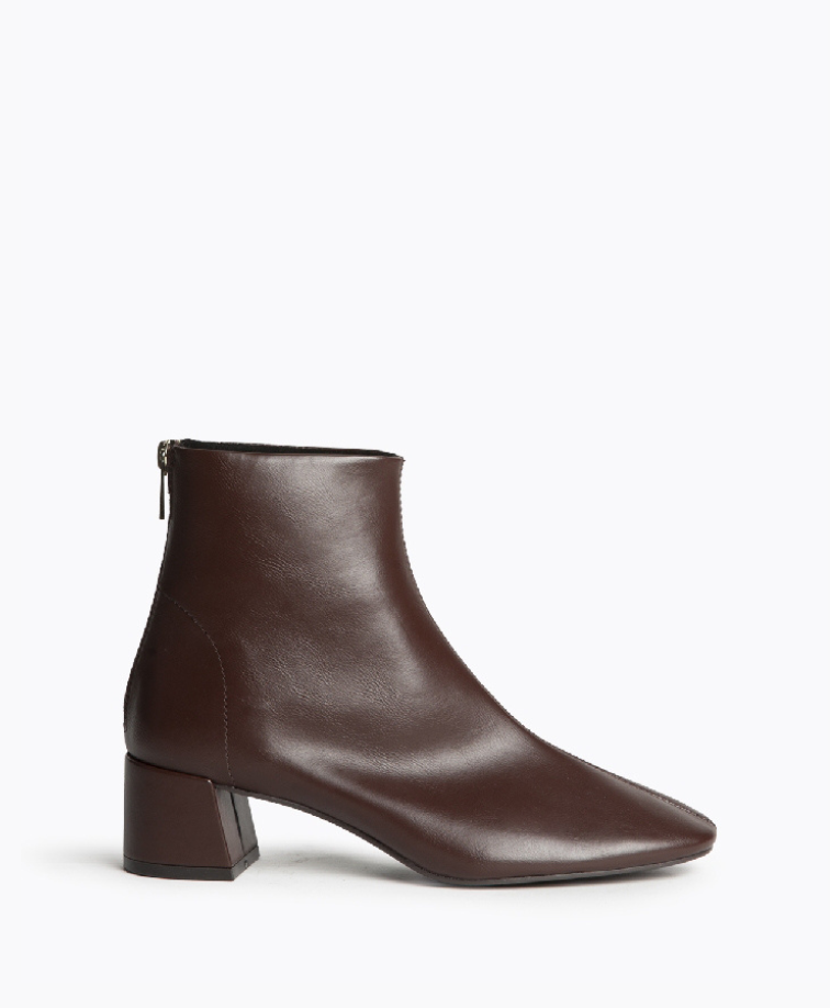 Botim de tacão baixo disponível em três cores: bordô, taupe e preto. Tacão largo. Biqueira arredondada. Fecho com zip na parte traseira.