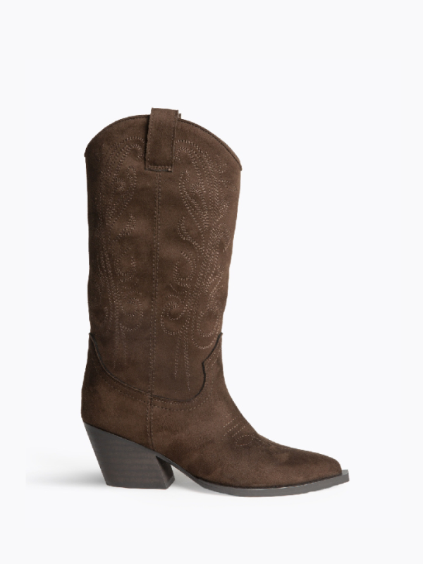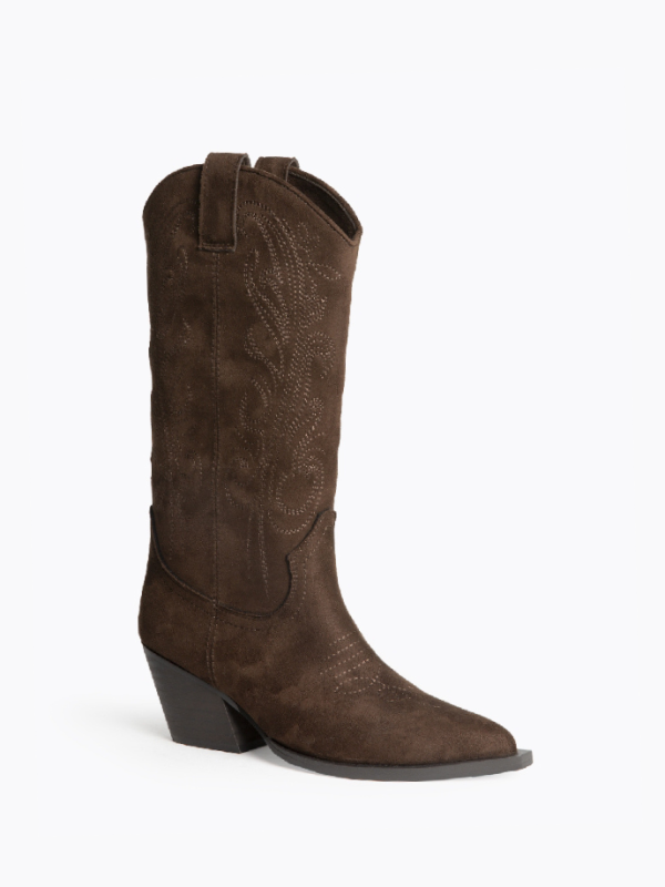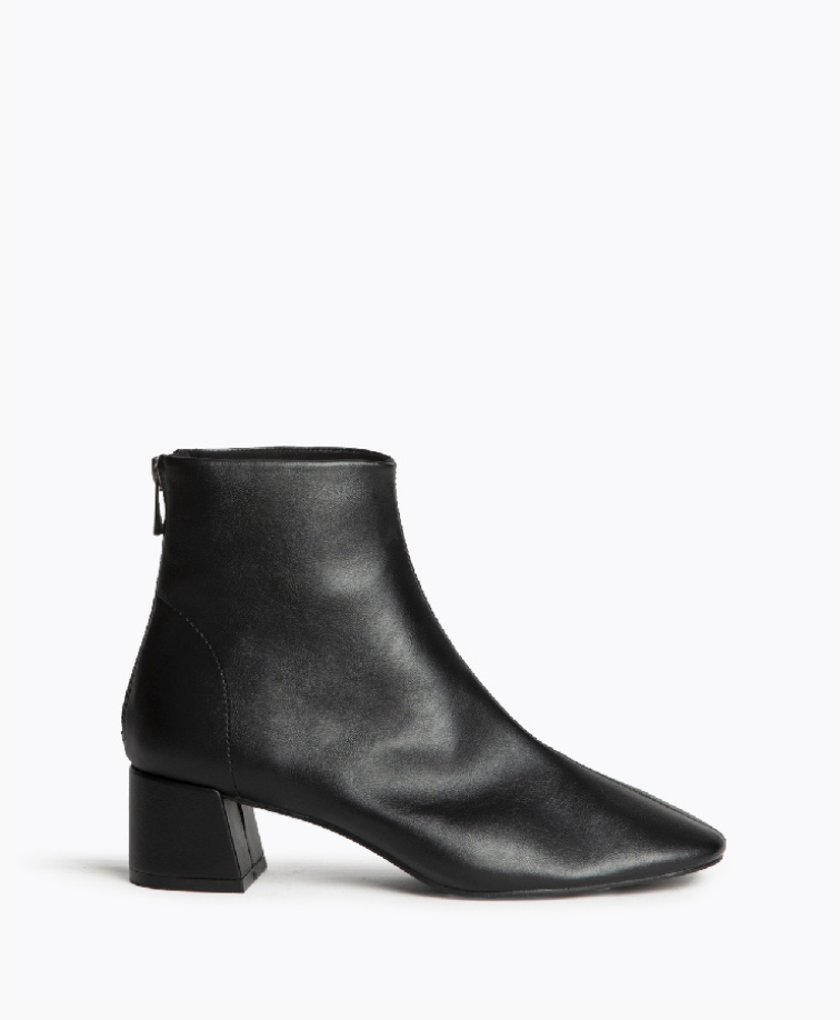 Botim de tacão baixo disponível em três cores: preto, taupe e bordô. Tacão largo. Biqueira arredondada. Fecho com zip na parte traseira.