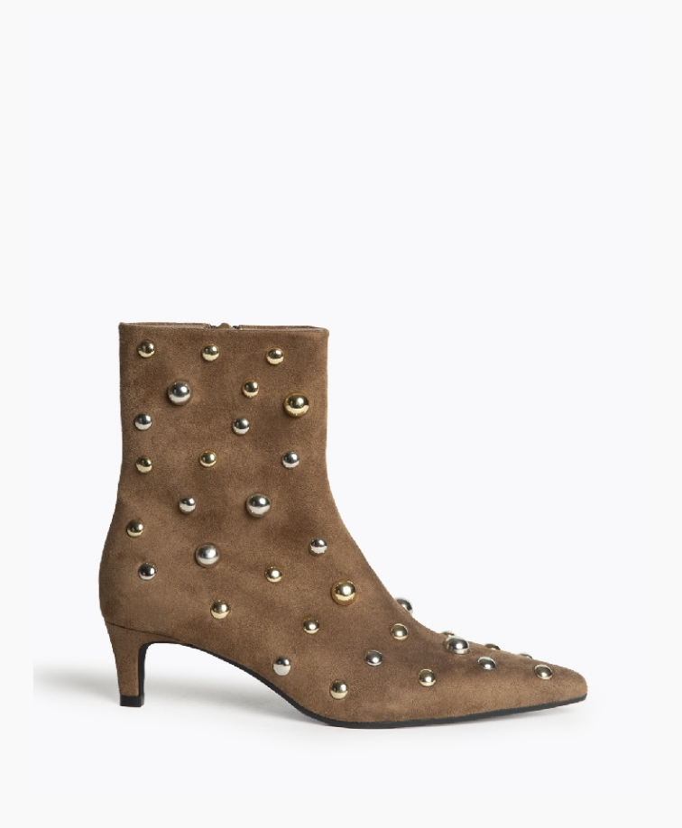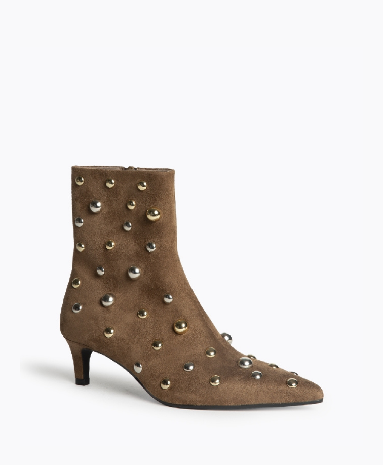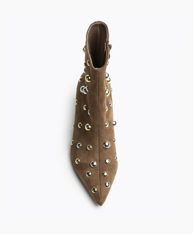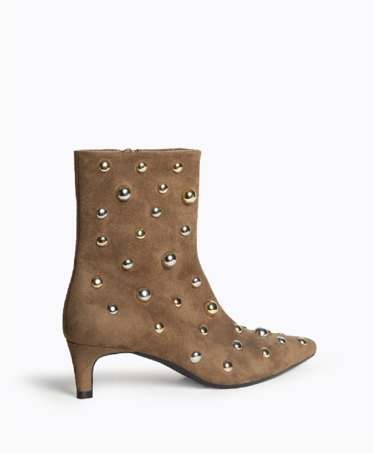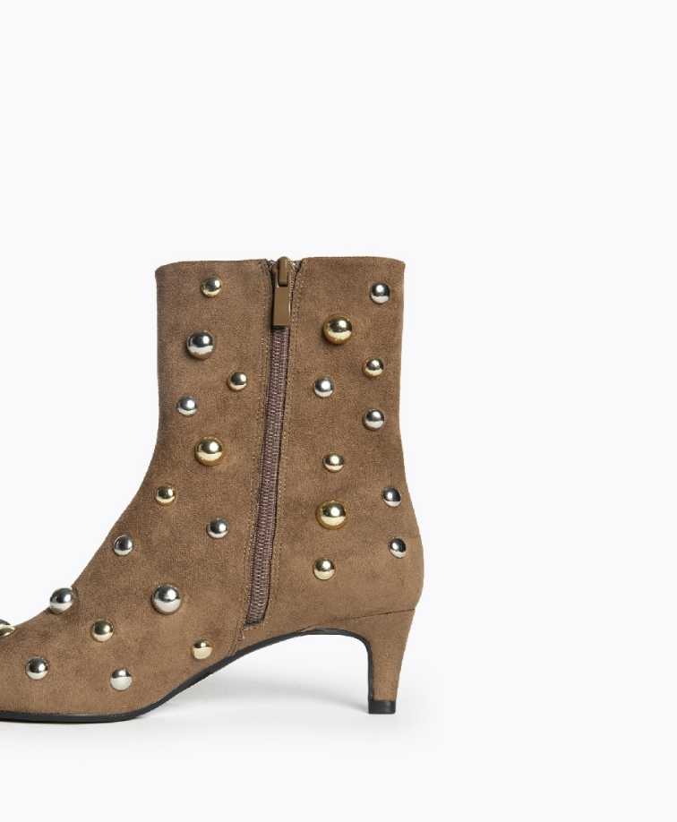 Botim de salto médio disponível em duas cores: camel e preto. Corte com pormenor de apliques metálicos com diferentes tamanhos. Salto fino. Biqueira pontiaguda. Fecho na parte lateral interna.