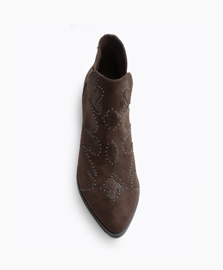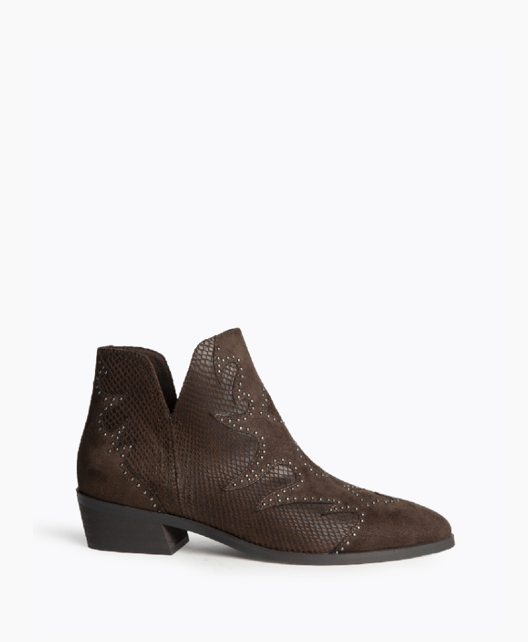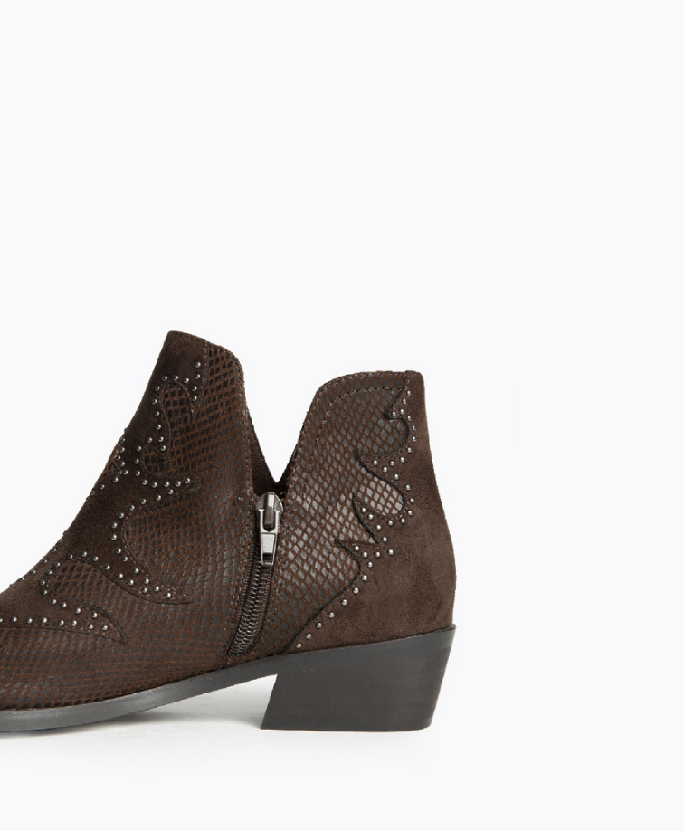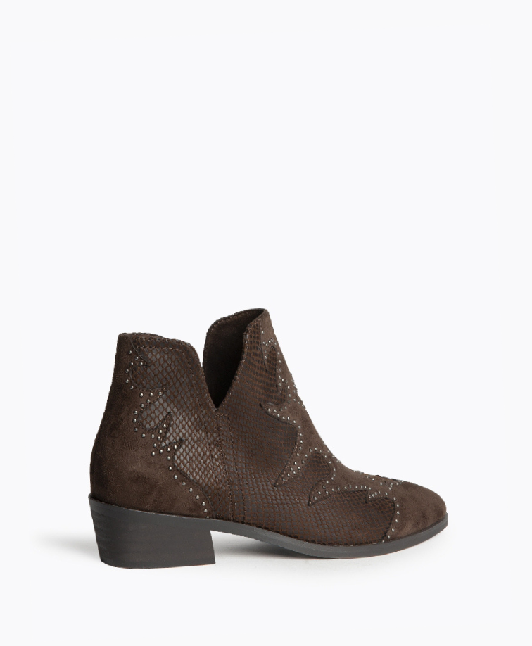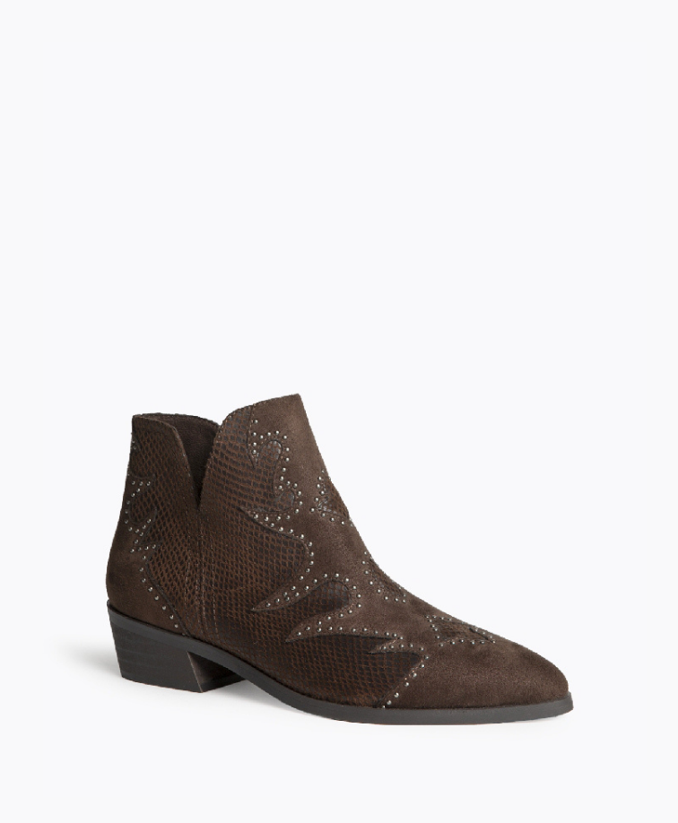 Botim de salto baixo disponível em duas cores: café e preto. Aberturas nas laterais. Corte com detalhes bordados e tachas. Biqueira pontiaguda. Tacão quadrado. Fecho na parte lateral interna.