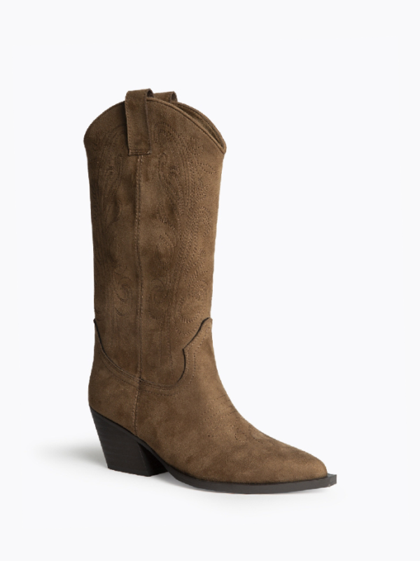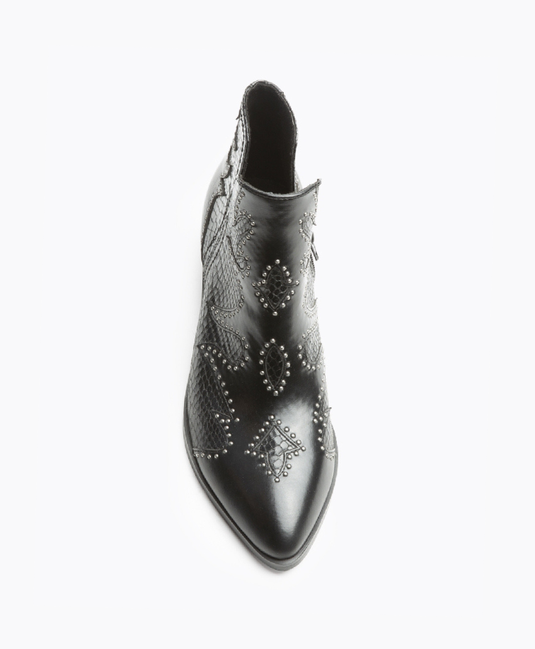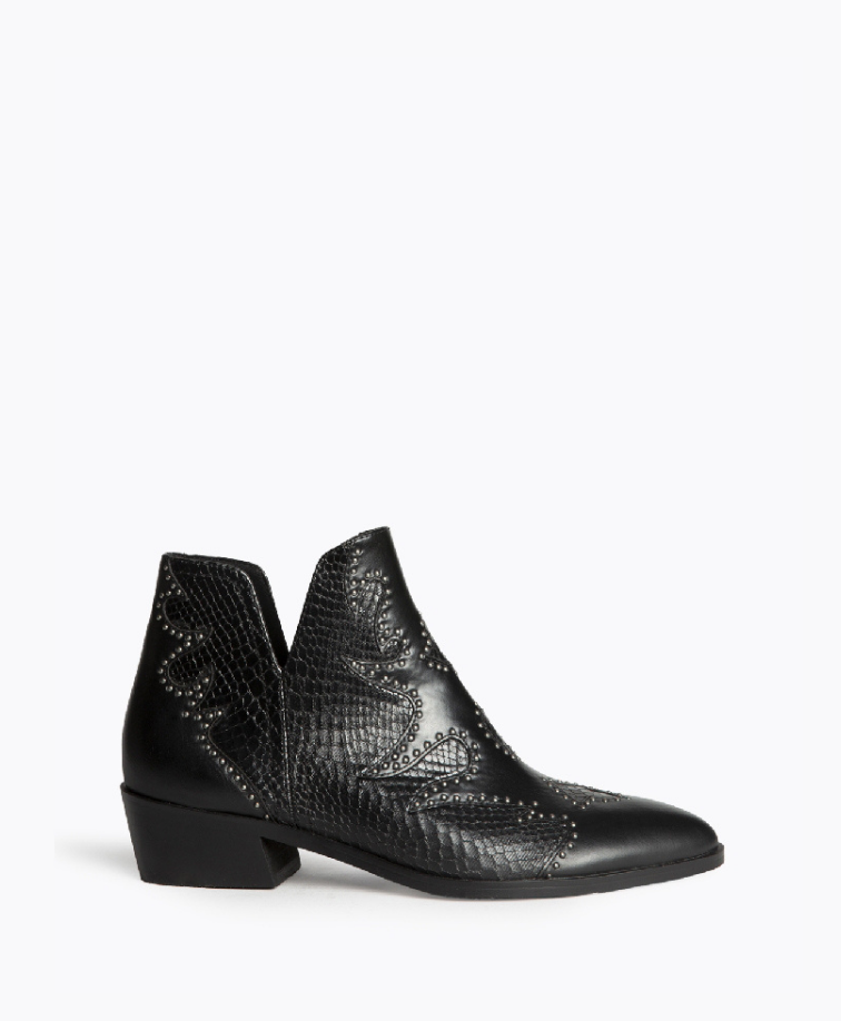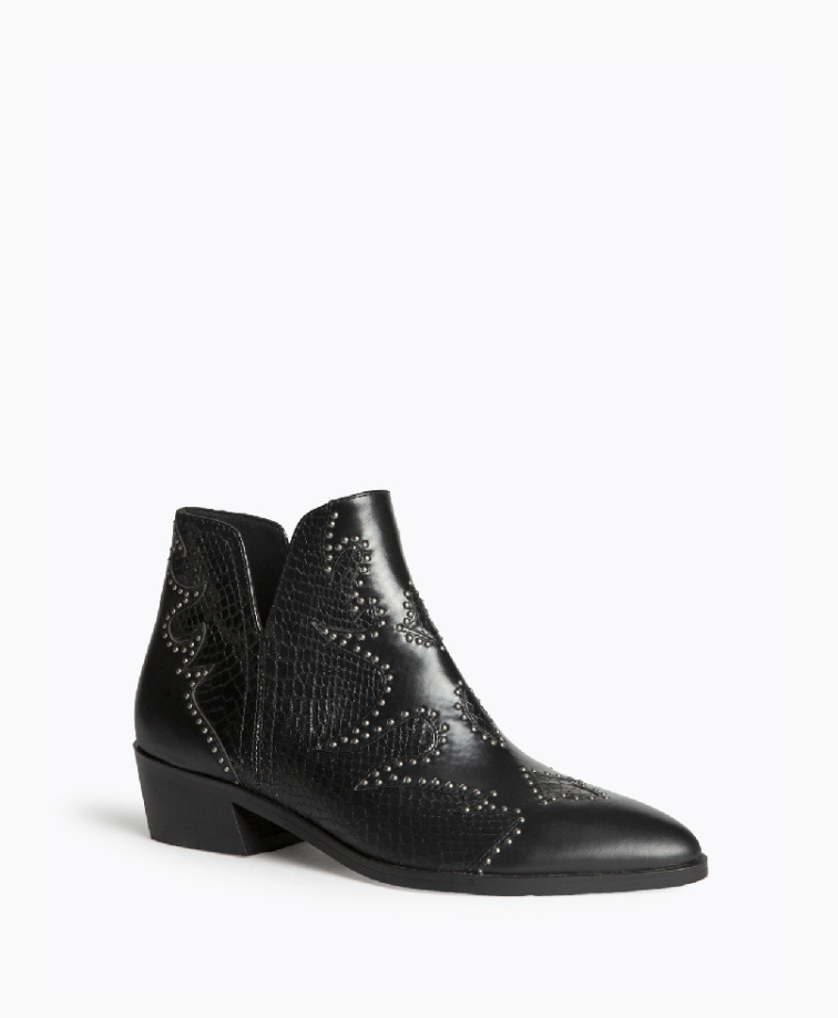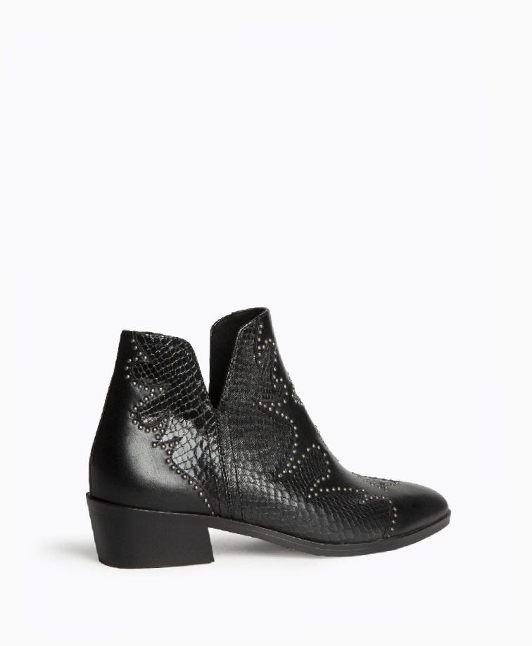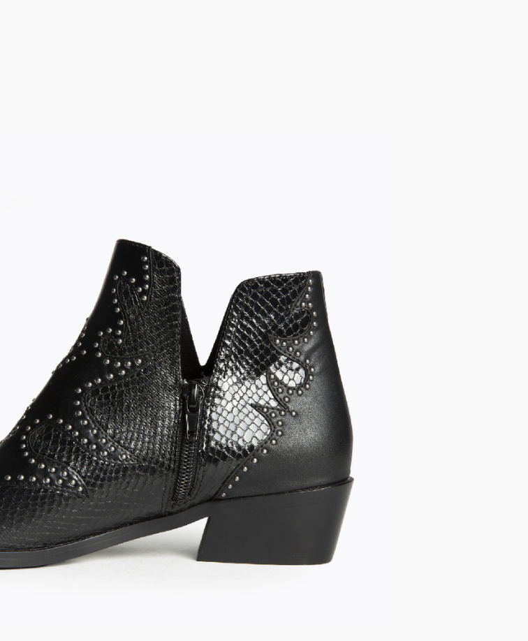 Botim de salto baixo disponível em duas cores: preto e café. Aberturas nas laterais. Corte com detalhes bordados e tachas. Biqueira pontiaguda. Tacão quadrado. Fecho na parte lateral interna.
