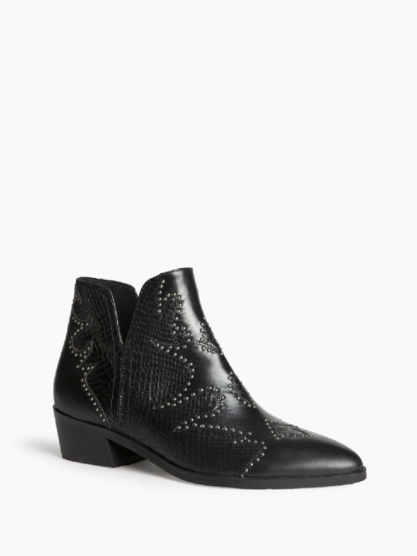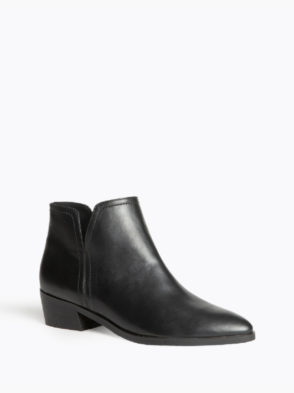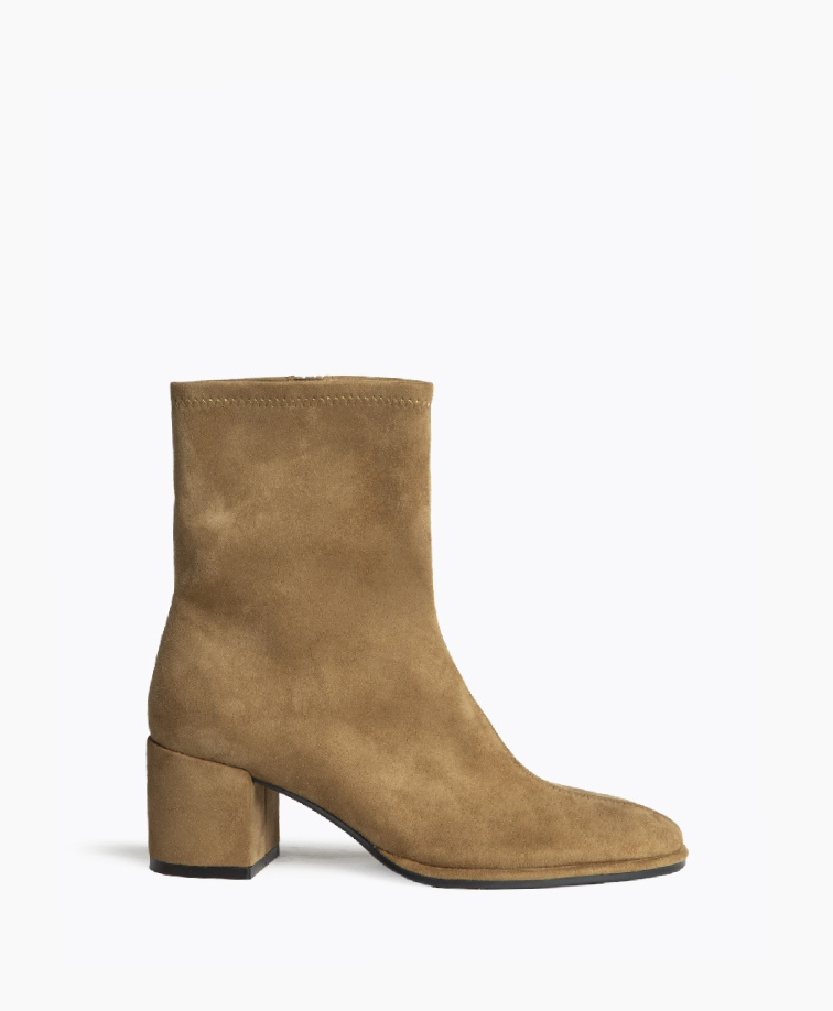 Botim de salto médio disponível em três cores: camel, café e preto. Fecho na parte lateral interna. Tacão quadrado largo. Biqueira arredondada.
