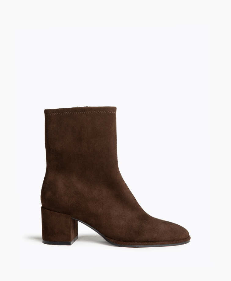 Botim de salto médio disponível em três cores: café, camel e preto. Fecho na parte lateral interna. Tacão quadrado largo. Biqueira arredondada.