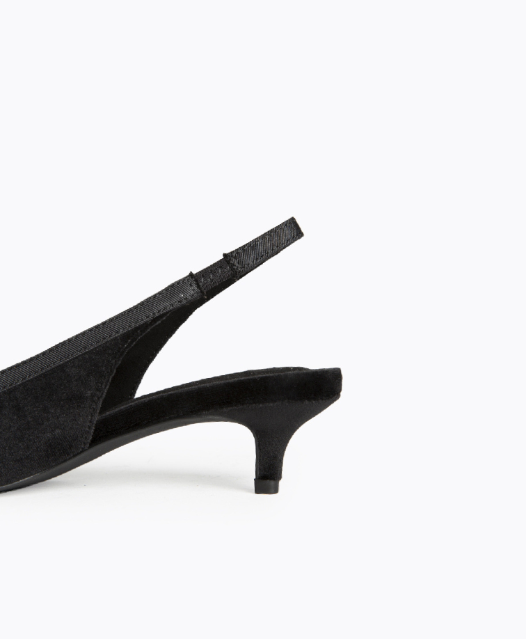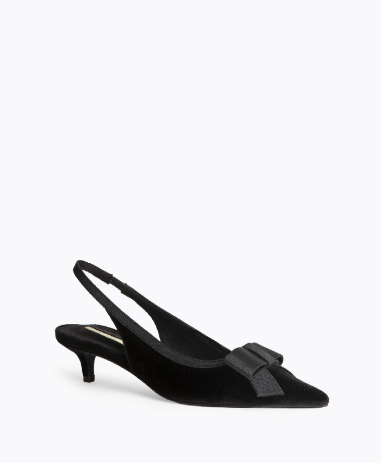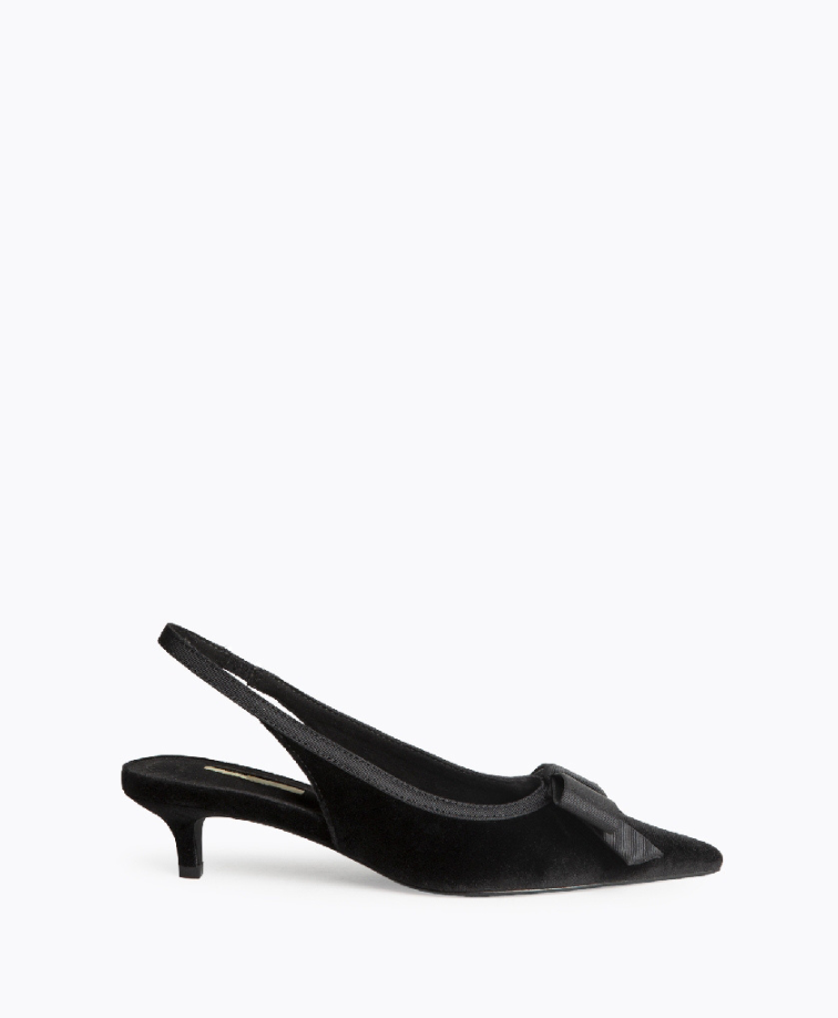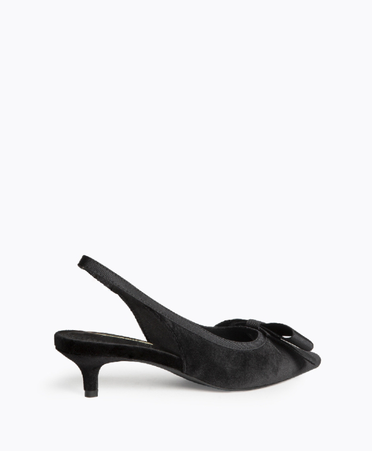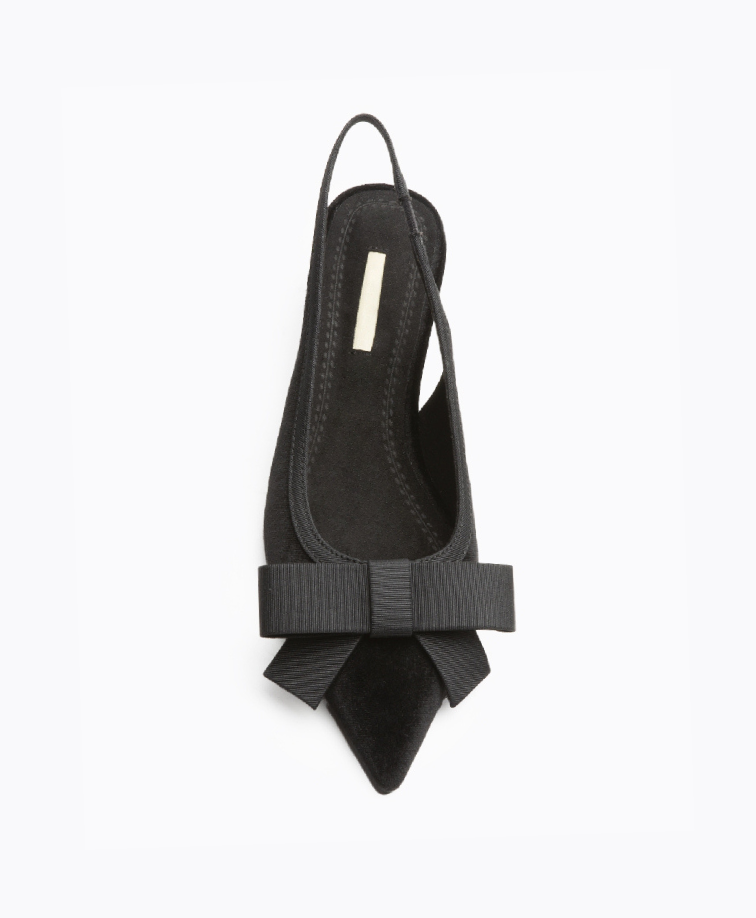 Sapato clássico disponível em duas cores: preto e camel. Corte frontal com detalhe de laço. Tira fina no calcanhar com elástico interno. Biqueira pontiaguda.