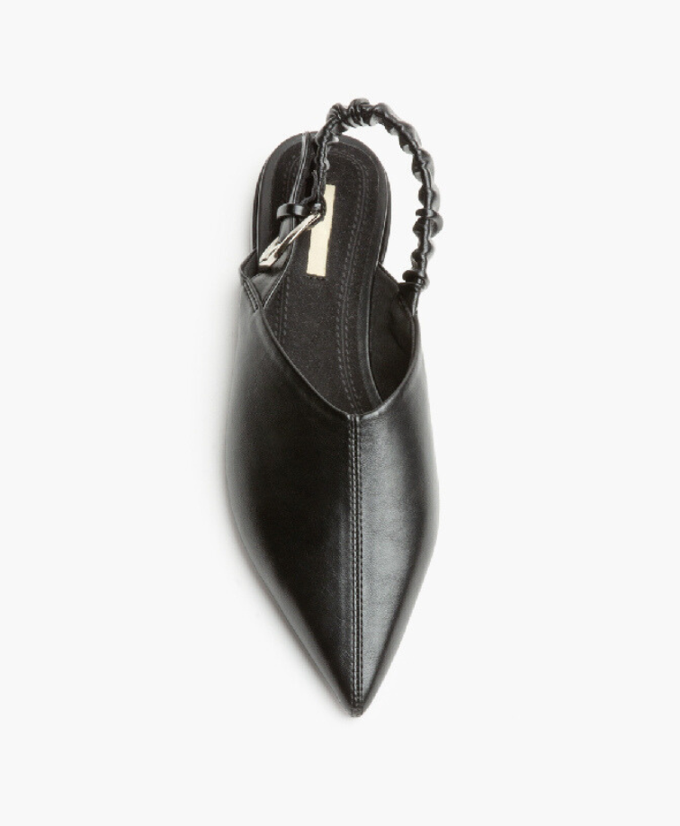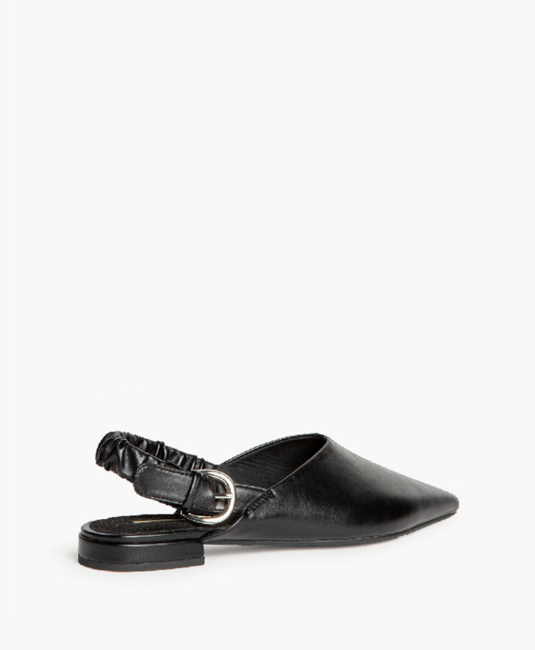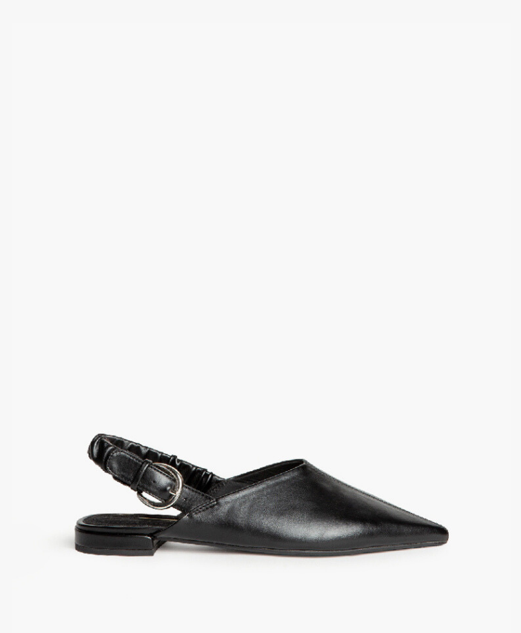 Sapato raso tipo mule disponível em duas cores: preto e bege. Detalhe de pesponto no corte. Tira com elástico no calcanhar e fivela na parte exterior. Biqueira pontiaguda.